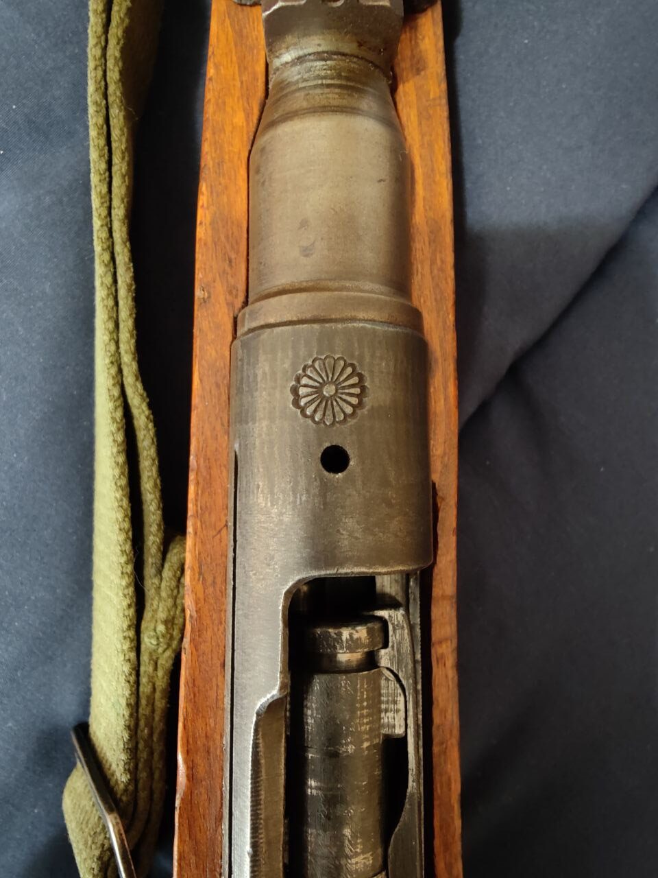 Imperial Japanese small arms were all marked with a floral seal representing the Chrysanthemum Throne and by extension the Empire itself. Most Japanese war surplus brought into the United States bear a large and unsightly blemish where the chrysanthemum was defaced or removed. Most sources report that this was done by the surrendering troops as a matter of honor, to prevent property marked with the emperor’s seal from falling into enemy hands. Mine is made less common and significantly more desirable by the presence of an intact chrysanthemum, referred to by collectors as the “’mum,” on its receiver. This suggests that a soldier or Marine pulled it from the hands of a fallen foe and survived long enough to bring it stateside as a souvenir. The cotton web sling you see on the left side isn’t standard—it most likely came from an M1, possibly added by the same G.I. who brought this rifle back from the Pacific theater.
