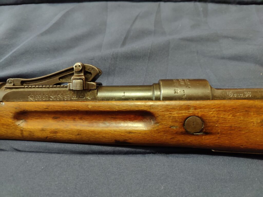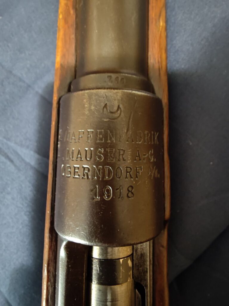 Which one of these four patterns is my rifle? None of the above, actually. During World War I, the Ottoman Empire’s urgent need for arms drove it to procure virtually anything that was available, particularly from the German Empire. Large numbers of surplus Gewehr 88 “commission rifles” and new-production Gewehr 98s were shipped to the Ottomans; my rifle is an example of the latter. It rolled off the line at the Waffenfabrik Mauser factory in Oberndorf am Neckar, Baden-Württemberg, in 1918.