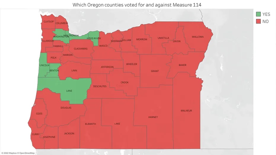 Measure 114 is a ballot measure that was narrowly passed (50.65% to 49.35%) by voters in November. Measure 114 would require a permit issued by local law enforcement to buy a firearm. It would require photo ID, fingerprints, safety training, criminal background check, and fees to apply for a permit. Measure 114 would also prohibit manufacturing, importing, selling, possessing, using, or transferring magazines with a capacity greater than 10 rounds.