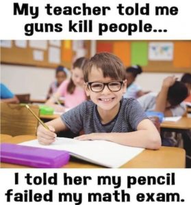 The picture, for those who haven’t seen it, shows a smiling young boy sitting in a classroom. The following is included on the picture: “My teacher told me guns kill people, I told her my pencil failed my math exam”. Most found this humorous.