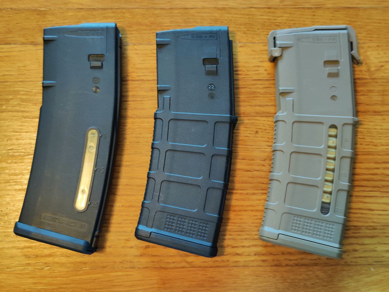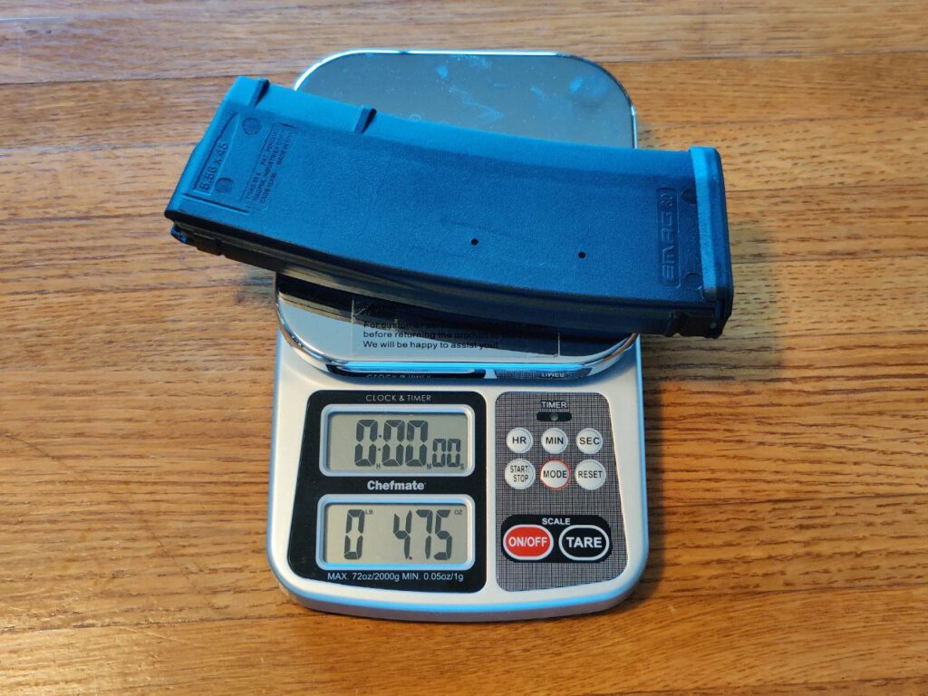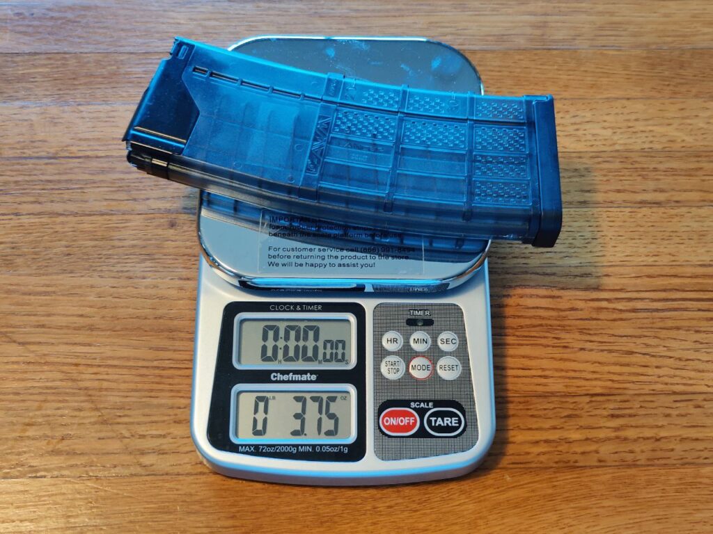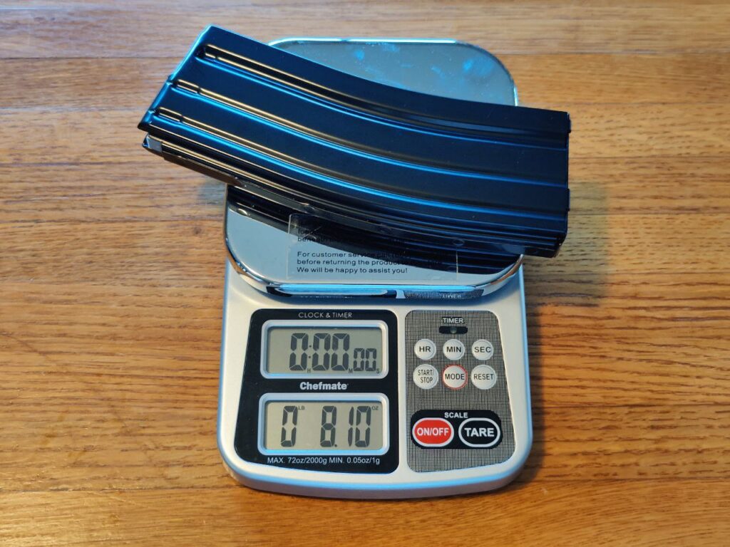 To show the weight difference between different types of AR-15 magazine, I weighed a few examples from my collection. I didn’t have access to an aluminum GI mag, but for reference, they’re said to weigh between 3.95 and 4.1 ounces. Note that the Korean-made steel magazine weighs about twice as much as an aluminum one, and about 60% more than a Gen 3 PMAG.